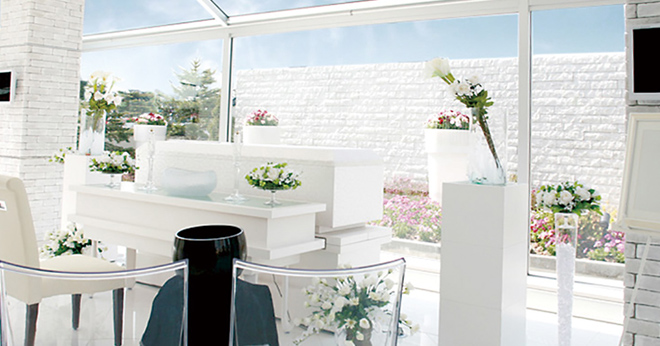 ガラス越しに彩られる四季折々の風景が、心にやさしくとけこんでいく透明感あふれるホールです。春から秋には季節の花々が咲き、冬にはイルミネーションが灯ります。白い空間に故人がお好きだった花々が映え、思い出も鮮やかによみがえるでしょう。