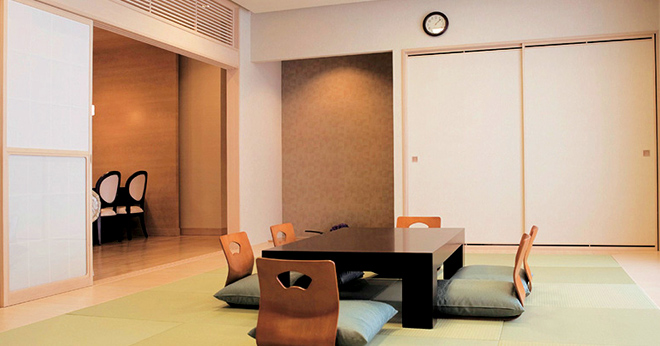 川のほとりに面している風情香る和室には広々としたテラスもあり、自然の風景や川のせせらぎにつつまれる癒しの時間をお過ごしいただけます。障子を開け放つとリビングとつながりますので、想い想いにくつろぎながら思い出を語り合ってください。
