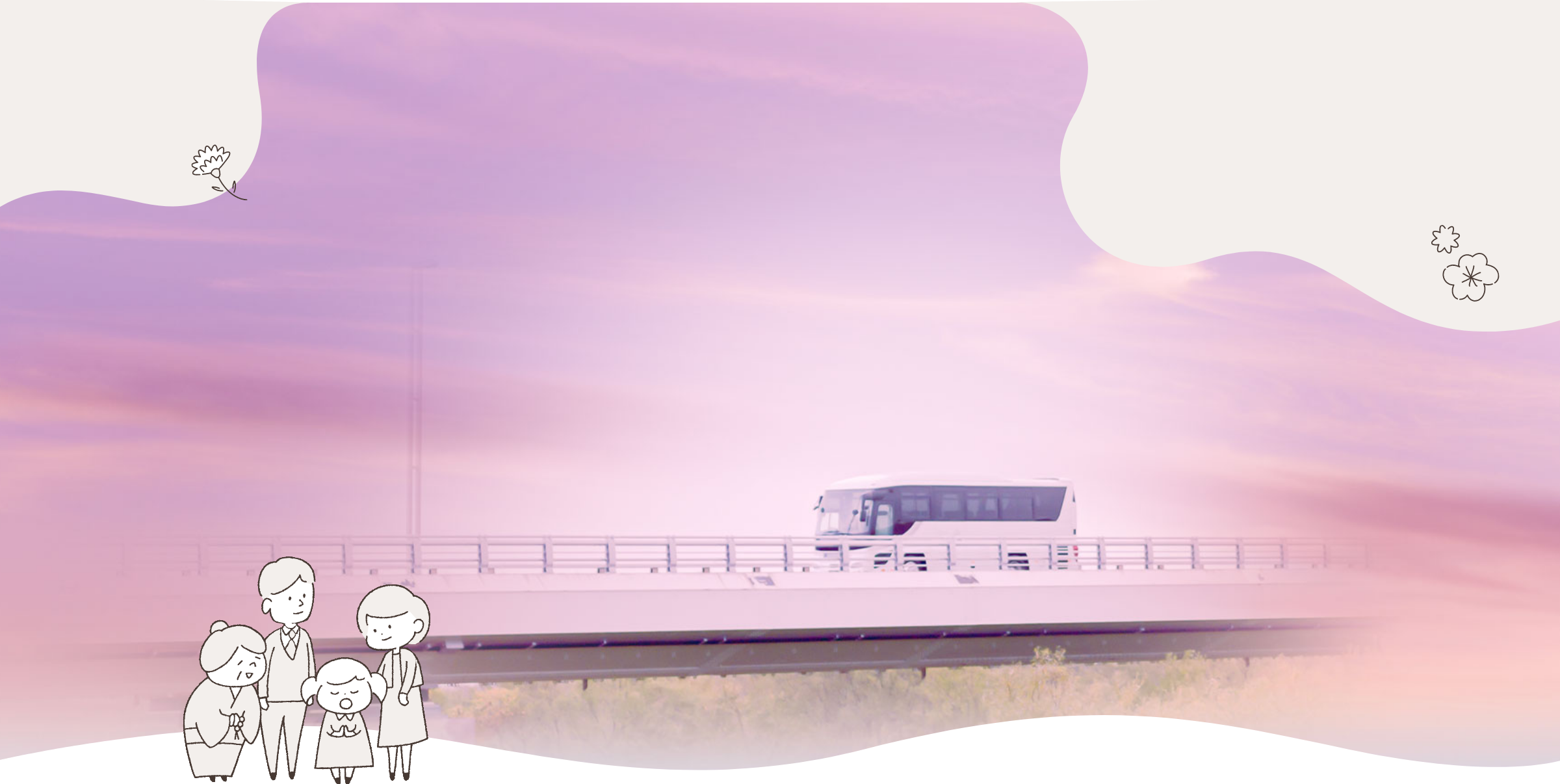 ご葬儀だけでなく、納骨式やご法要の際にご利用いただくことも可能です。ご家族やご親戚、故人様のご友人など、普段は集まる機会の無い方々がご一緒に、故郷や想い出の地を巡ることで、懐かしい記憶がよみがえる時間をお過ごしいただけます。