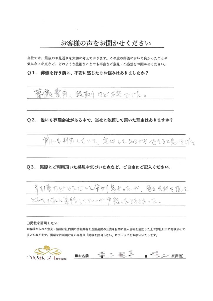 葬儀費用、段取りなど不安でした