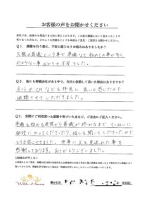 過去の経験があったので、事前に電話で確認したので、不安はそんなにありませんでした。また葬儀会社の方々に説明して頂いたりが良かったです。