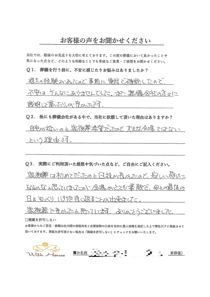 家族葬は初めてだったのと日程が長かったので、寂しい感じになるかなと思っていましたが、会場がとても素敵で、母との最後の日をゆっくり心地良く過ごすことが出来ました。