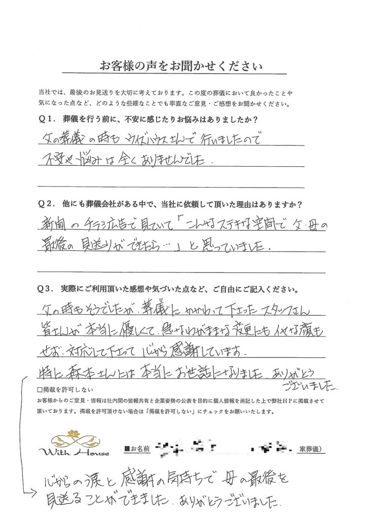 父の葬儀の時もウィズハウスさんで行いましたので、不安や悩みは全くありませんでした。
