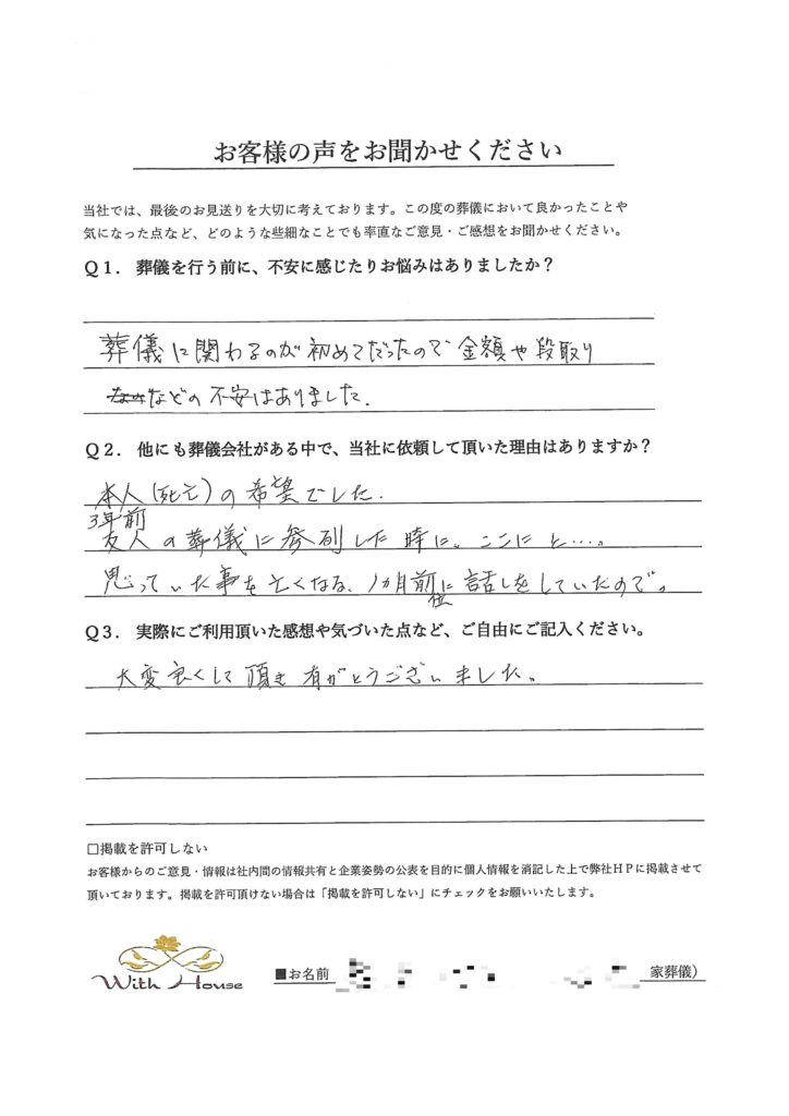 葬儀に関わるのが初めてだったので、金額や段取りなどの不安はありました。