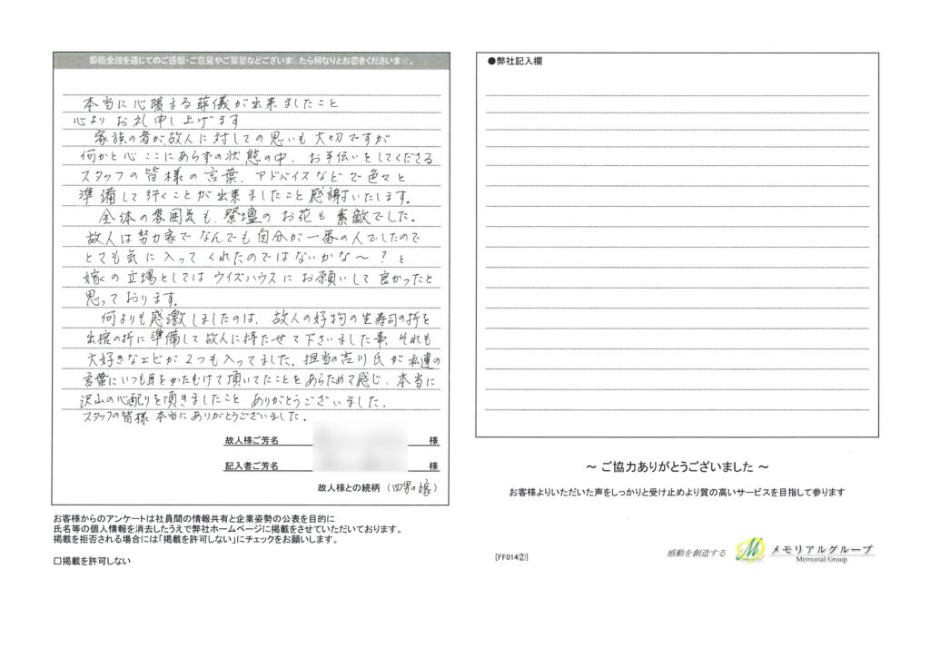 ウィズハウス北12 投稿日:2016年1月14日 平成27年12月「ウィズハウス北12条」ご利用のお客様 アンケート ウィズハウス北12 担当プランナーより 吉川 琢也 この度は、まだお忙しい中アンケートのご返送をいただきまして感謝申し上げます。 さらにとてもありがたいお褒めのお言葉までいただきまして誠にありがとうございました。 先日、喪主様にはお忙しい中何度もお電話をかけてしまい申し訳ありませんでした。 49日を過ぎて、落ち着きましたらまたお話しをさせていただきます。 この度は、大切な方のご葬儀のお手伝いをさせていただきありがとうございました。 この度は、まだお忙しい中アンケートのご返送をいただきまして感謝申し上げます。 さらにとてもありがたいお褒めのお言葉までいただきまして誠にありがとうございました。 先日、喪主様にはお忙しい中何度もお電話をかけてしまい申し訳ありませんでした。 49日を過ぎて、落ち着きましたらまたお話しをさせていただきます。 この度は、大切な方のご葬儀のお手伝いをさせていただきありがとうございました。
