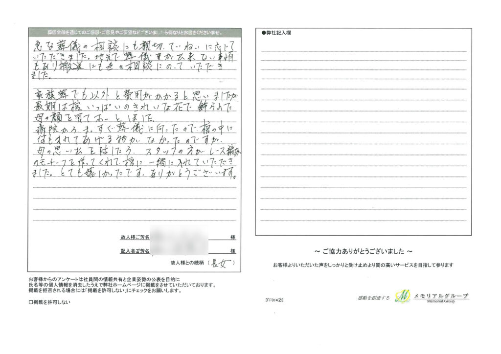 ウィズハウス北12 投稿日:2016年3月7日 平成28年1月「ウィズハウス北12」ご利用のお客様 アンケート ウィズハウス北12 担当プランナーより 吉川 琢也 この度はお忙しい中アンケートにお答えいただき感謝いたしております。 少しづつ普段の生活に戻りつつあるのでしょうか? ご葬儀前よりお話しをさせていただき、様々なご不安を抱えておられておりましたが、ご葬儀も順調に進み何事もなく終えられて私も安堵致しております。 中でも、レースを一生懸命に編んだスタッフも上手にはできなかったけど喪主様たちにお喜びいただいて良かったと喜んでおりました。 今後もご不明な点などがございましたら、何なりと申し付けくださいませ。 この度は大切な方のお別れのお手伝いをさせていただきありがとうございました。 この度はお忙しい中アンケートにお答えいただき感謝いたしております。 少しづつ普段の生活に戻りつつあるのでしょうか? ご葬儀前よりお話しをさせていただき、様々なご不安を抱えておられておりましたが、ご葬儀も順調に進み何事もなく終えられて私も安堵致しております。 中でも、レースを一生懸命に編んだスタッフも上手にはできなかったけど喪主様たちにお喜びいただいて良かったと喜んでおりました。 今後もご不明な点などがございましたら、何なりと申し付けくださいませ。 この度は大切な方のお別れのお手伝いをさせていただきありがとうございました。