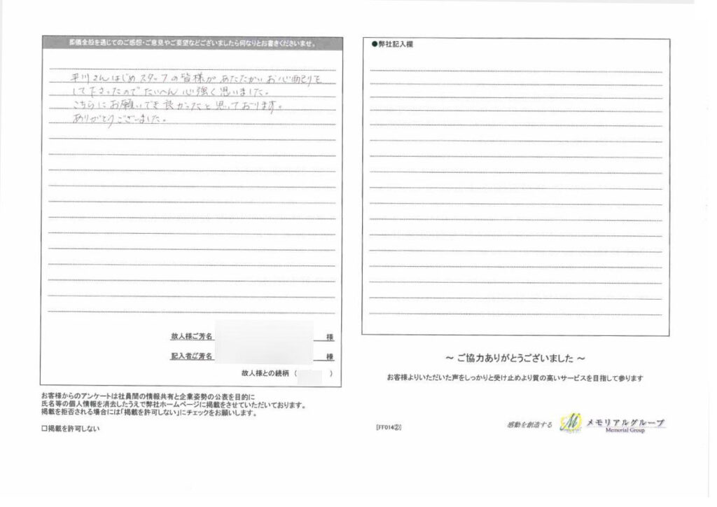 ウィズハウス北12 投稿日:2015年7月30日 平成26年11月「ウィズハウス北12」ご利用のお客様 アンケート ウィズハウス北12 担当プランナーより 平川 将太 この度はお忙しい中、弊社アンケートにご協力頂き、誠にありがとうございます。 また、有難いお言葉まで頂き、担当者含めスタッフ一同、只々恐縮するばかりで御座います。 これからも、ご自宅に伺わせて頂くことが、あろうかと思いますが その時は宜しくお願い致します。 少しでも不明な点、疑問な点等、御座いましたらご連絡をお待ちしております。 この度は、誠にありがとうございました。 この度はお忙しい中、弊社アンケートにご協力頂き、誠にありがとうございます。 また、有難いお言葉まで頂き、担当者含めスタッフ一同、只々恐縮するばかりで御座います。 これからも、ご自宅に伺わせて頂くことが、あろうかと思いますが その時は宜しくお願い致します。 少しでも不明な点、疑問な点等、御座いましたらご連絡をお待ちしております。 この度は、誠にありがとうございました。