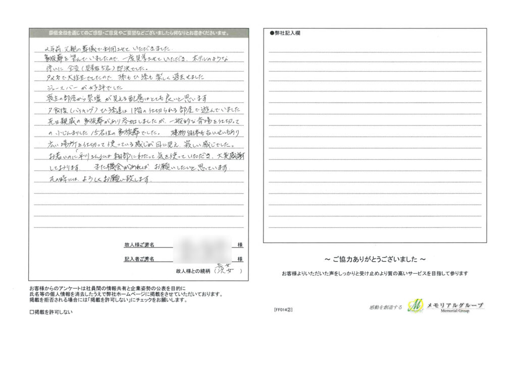 ウィズハウス北12 投稿日:2014年7月14日 平成26年7月「ウィズハウス北12」ご利用のお客様 アンケート ウィズハウス北12 担当プランナーより 平川 将太 この度は、弊社アンケートへご協力頂き、有難う御座います その上、有難いお言葉を頂戴し、私共スタッフ一同只々恐縮するばかりでございます。 ドリンクバーにつきましては、お子様からご年配の方まで喜んで頂ける様、ジュース類からお茶、珈琲等、種類をご用意させて頂き更に皆様にご利用して頂けるようにと、フリーで開放させて頂いている物で御座います。 皆様に、より一層喜んで頂ける様、スタッフ一同で施設、サービスの質を高めて参ります。 また、これからもお困りの事が御座いましたら、いつでもご連絡下さいませ。 誠に、有難う御座いました。 この度は、弊社アンケートへご協力頂き、有難う御座います その上、有難いお言葉を頂戴し、私共スタッフ一同只々恐縮するばかりでございます。 ドリンクバーにつきましては、お子様からご年配の方まで喜んで頂ける様、ジュース類からお茶、珈琲等、種類をご用意させて頂き更に皆様にご利用して頂けるようにと、フリーで開放させて頂いている物で御座います。 皆様に、より一層喜んで頂ける様、スタッフ一同で施設、サービスの質を高めて参ります。 また、これからもお困りの事が御座いましたら、いつでもご連絡下さいませ。 誠に、有難う御座いました。