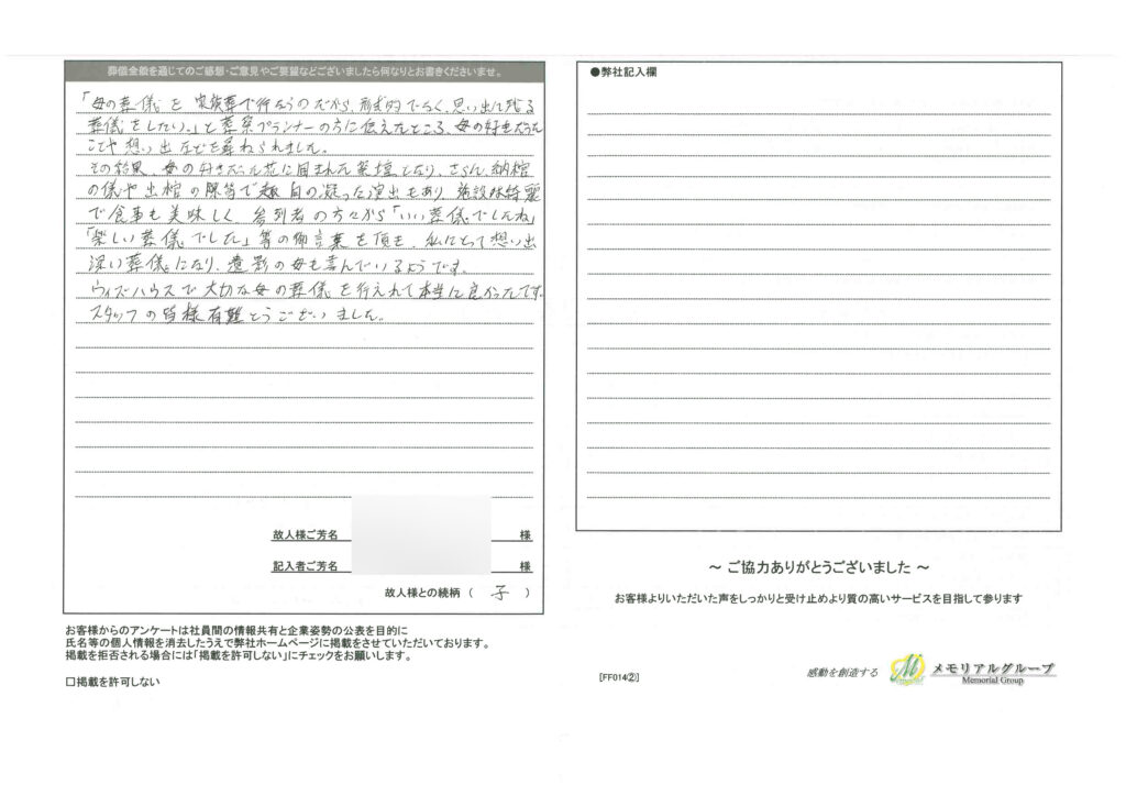 ウィズハウス北12 投稿日:2016年9月16日 平成28年7月「ウィズハウス北12」ご利用のお客様 アンケート ウィズハウス北12 担当プランナーより 塩谷 未来 アンケートにご協力いただきましてありがとうございます。 高い評価を頂き、スタッフ一同感謝いたします。 四国の旅行のお話、思い出深い土曜日のお話…などお母様との思い出を沢山お話しくださいました。 お母様は今頃、お父様と旅行へ出かけているころでしょうか?最近の私は、毎週土曜日になるとカレーが食べたくなります! お困りのことがありましたらいつでもご相談ください。 季節の変わり目で気温の変化もございますのでご自愛くださいませ。 この度は大切なご家族のご葬儀のお手伝いをさせていただきありがとうございました。 アンケートにご協力いただきましてありがとうございます。 高い評価を頂き、スタッフ一同感謝いたします。 四国の旅行のお話、思い出深い土曜日のお話…などお母様との思い出を沢山お話しくださいました。 お母様は今頃、お父様と旅行へ出かけているころでしょうか?最近の私は、毎週土曜日になるとカレーが食べたくなります! お困りのことがありましたらいつでもご相談ください。 季節の変わり目で気温の変化もございますのでご自愛くださいませ。 この度は大切なご家族のご葬儀のお手伝いをさせていただきありがとうございました。