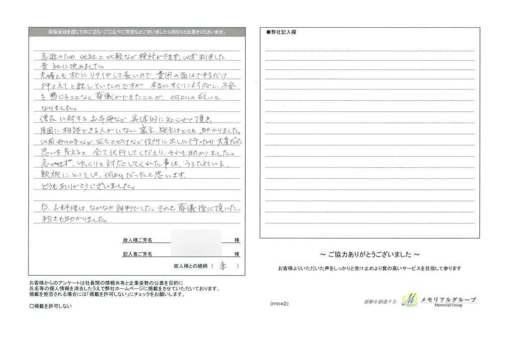 夫婦ともすでにリタイアして長いので、費用の面はできるだけ抑えてとお話していたのですが、本当にすぐに対応し不安を感じることなく葬儀ができたことが、何よりの救いとなりました。