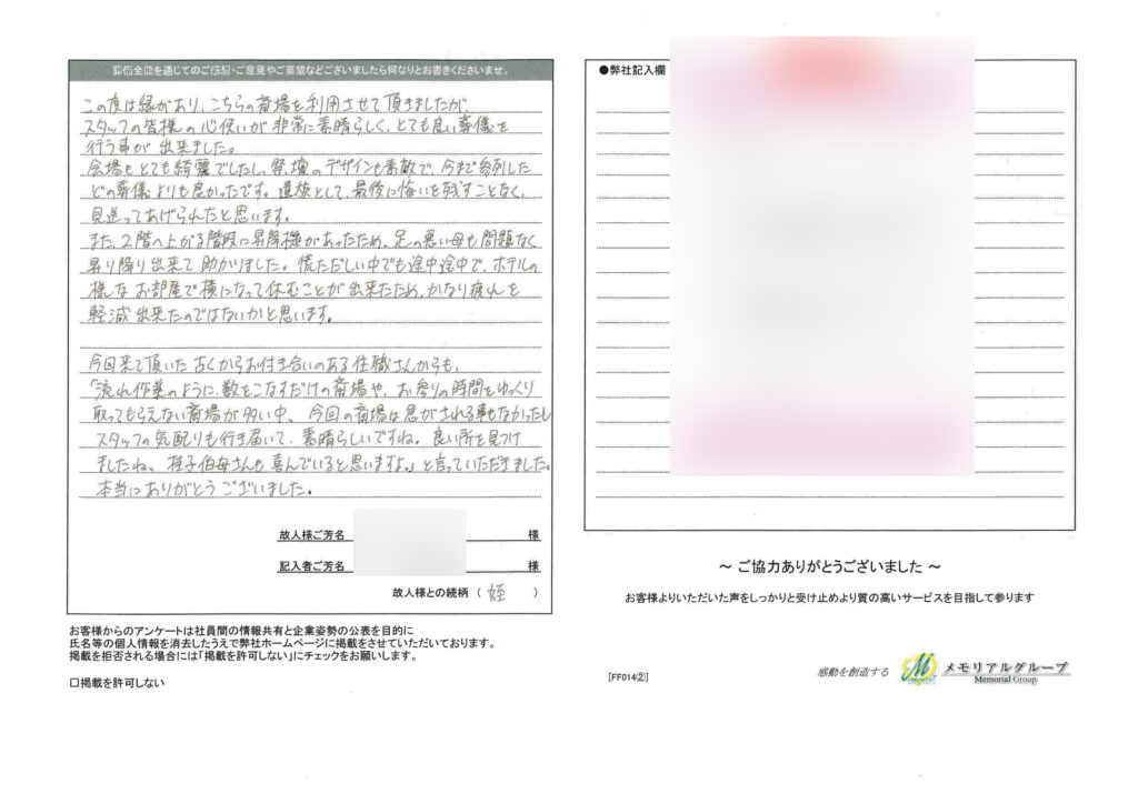 今回来て頂いた古くからお付き合いのある住職さんからも「流れ作業のように数をこなすだけの斎場や、お参りの時間をゆっくり取ってもらえない斎場が多い中、今回の斎場は急がされることも無かったし、スタッフの気配りも行き届いて素晴らしいですね。良いところを見つけましたね。伯母さんも喜んでいると思いますよ。」と言って頂きました。本当にありがとうございました。