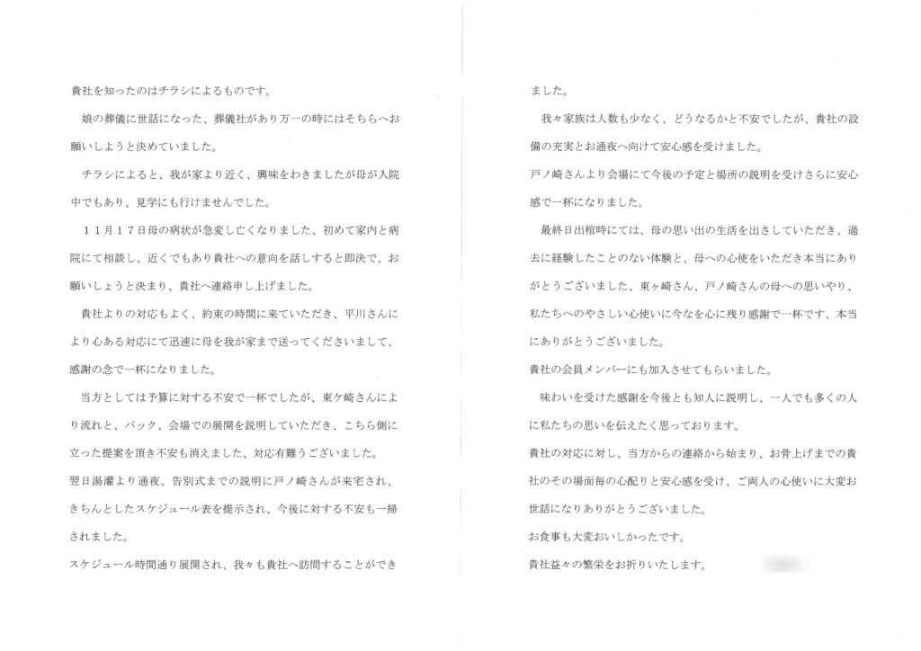 当方の連絡から始まり、お骨上げまでの貴社のその場面ごとの心配りと安心感を受け、ご両人の心遣いに大変お世話になり、ありがとうございました。食事も大変おいしかったです。