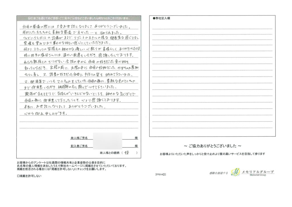 親族が気もそぞろで気持ちが行き届かないところを、細やかな気配りで伯母の為にご用意して下さったこと心より感謝しております。