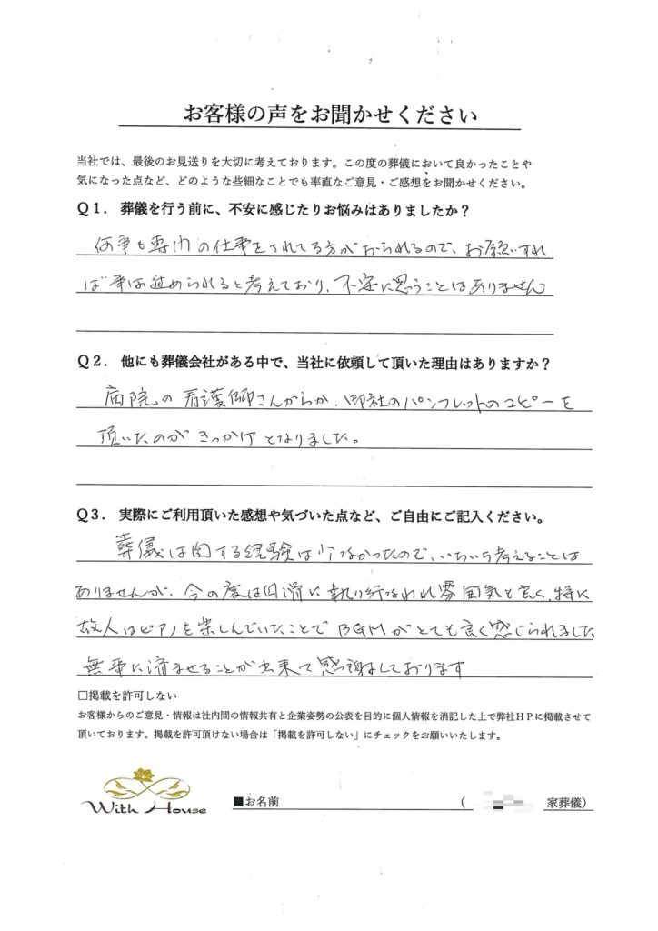 葬儀に関する経験は少なかったので、いちいち考えることはありませんが、この度は円滑に執り行われ