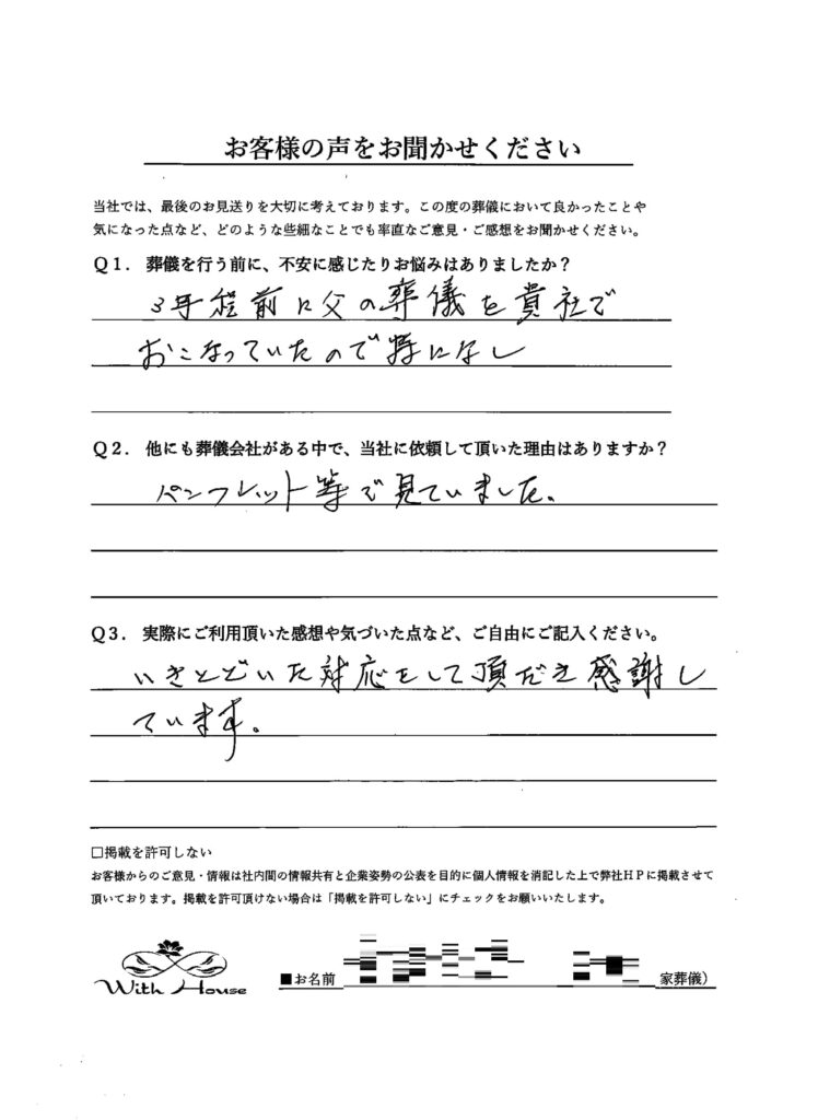 3年程前に父の葬儀を貴社で行っていたので特になし。