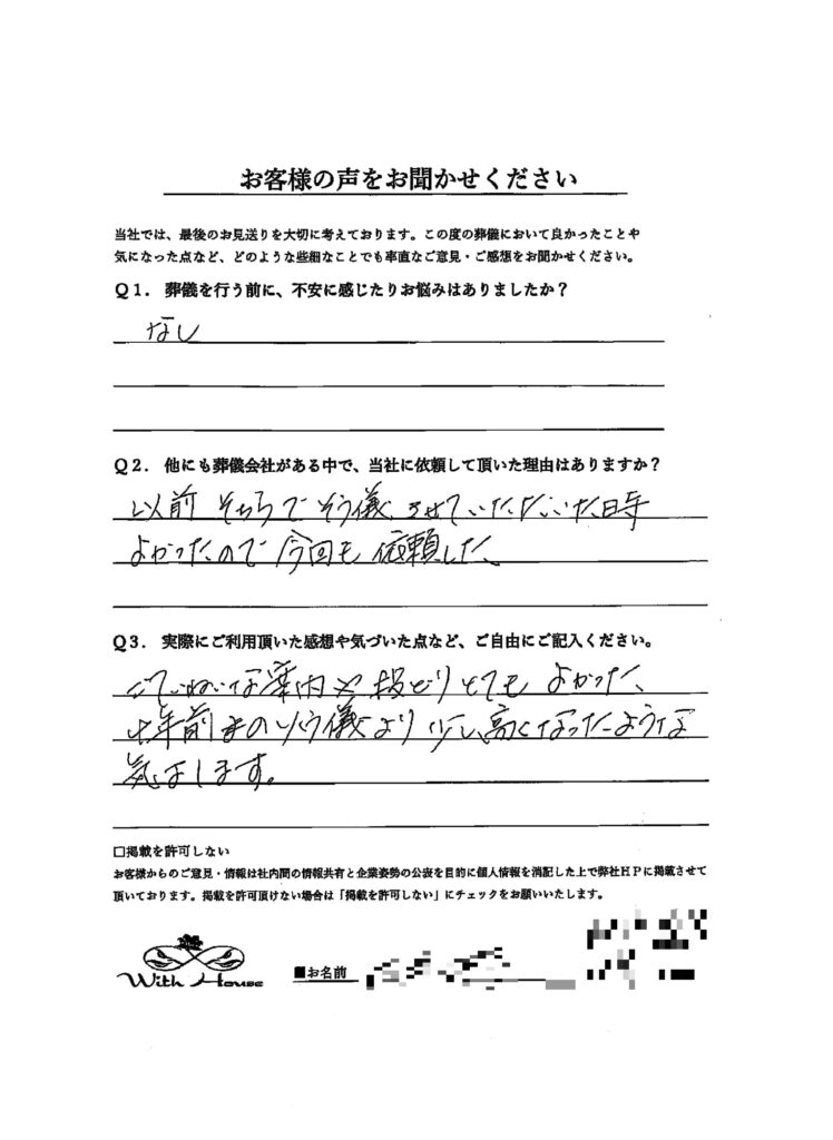 以前、そちらで葬儀させていただいた時、良かったので今回も依頼した。