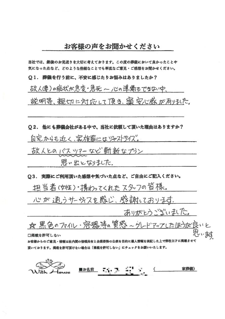 故人(妻)の病状が急変・急死~心の準備もできない中、説明等親切に対応して頂き、安心感がありました。